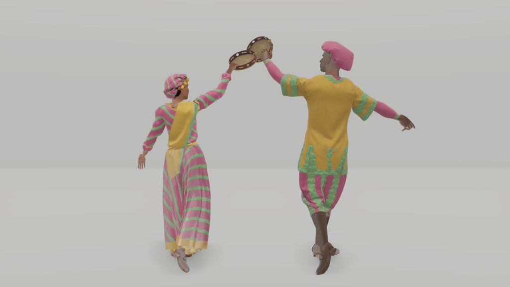 Le motif des rayures revient de manière récurrente et a servi de base pour la conception des costumes. Concernant les couleurs, notre choix s’est orienté vers une combinaison de rose, bois, vert qui semble assez typique des matériaux historiques collectés.